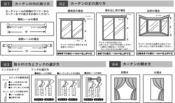 ▽カーテンのサイズの測り方(クリックすると拡大します) *オーダーにつき、カーテンフックのタイプの指定はできません。